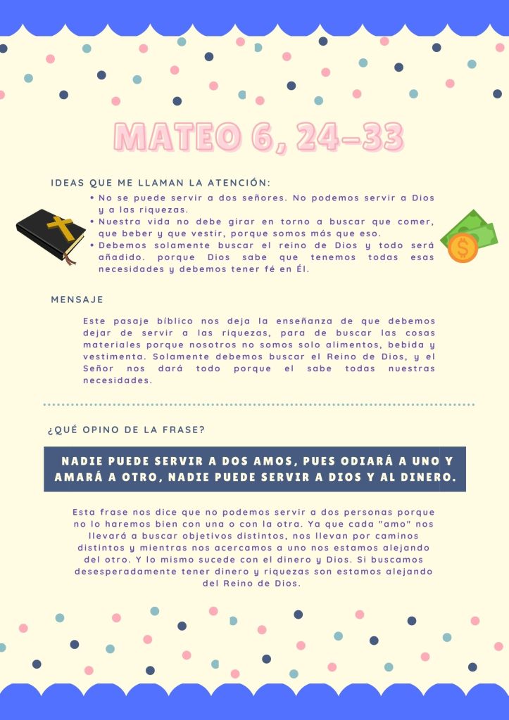 1. lea el texto bíblico: Mateo 6, 24-33 y realice lo siguiente: de manera creativa: